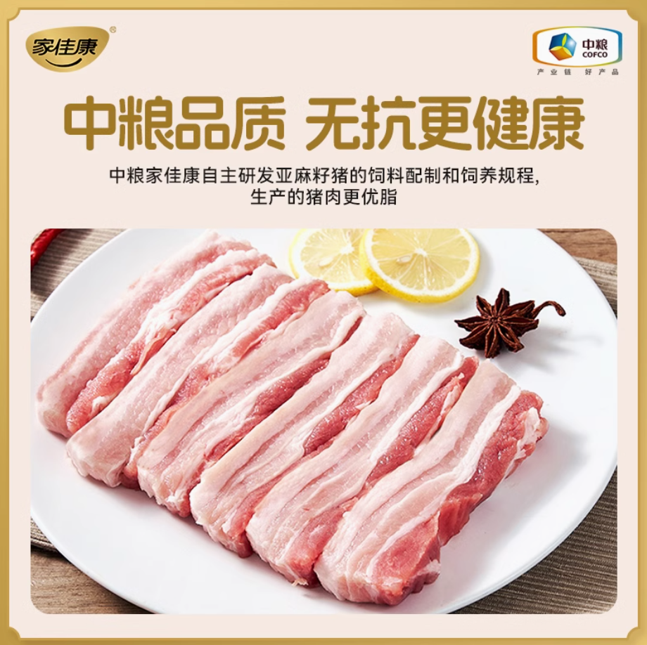 中粮家佳康国产亚麻籽猪五花肉新鲜腩条带皮三层厚切生鲜猪肉